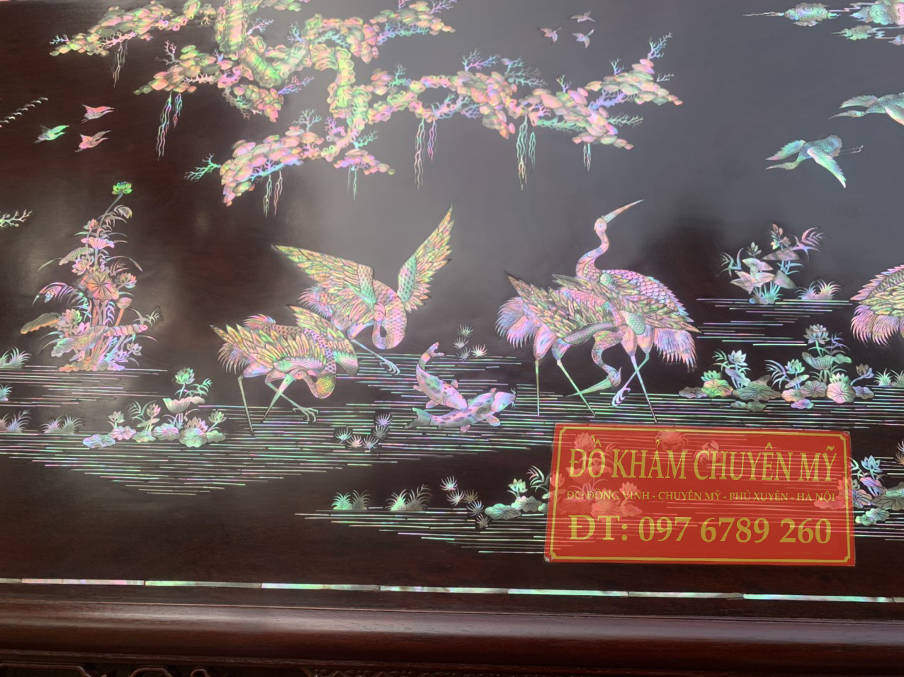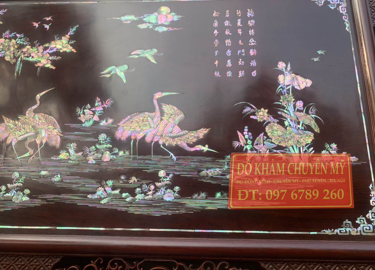 Nguyên liệu khảm: nguyên liệu chính là ốc đỏ nhập khẩu Singapore, ngoài ra còn điểm phối màu, phân cảnh bằng cửu khổng.