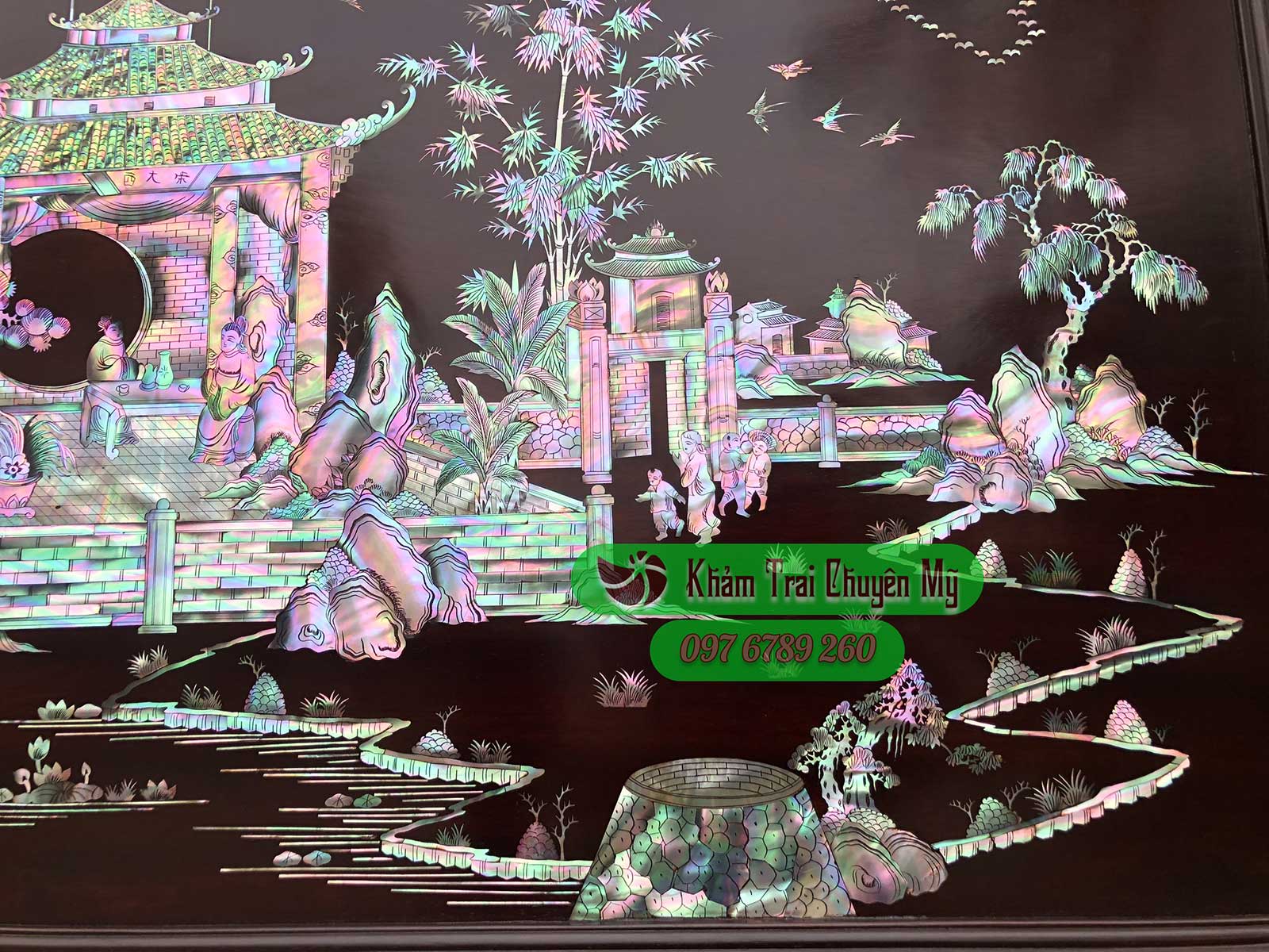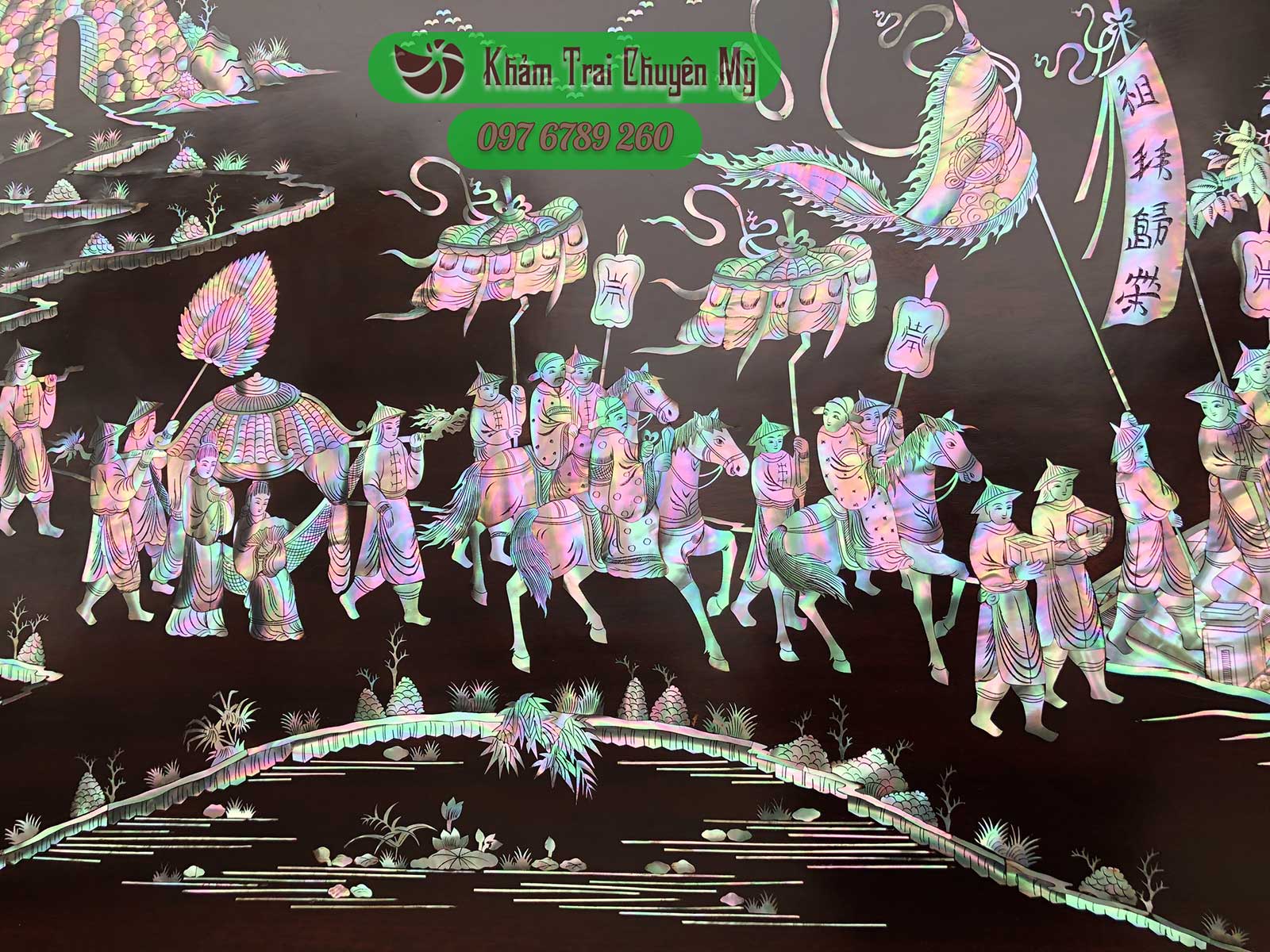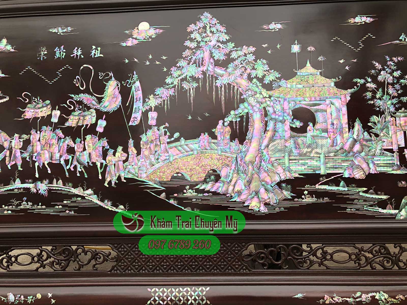 TRANH KHẢM ỐC VINH QUY BÁI TỔ Nét đẹp trường tồn qua năm tháng Tranh Vinh Quy Bái Tổ kích thước 217x107cm, khảm ốc nhập khẩu trên nền gỗ gụ.