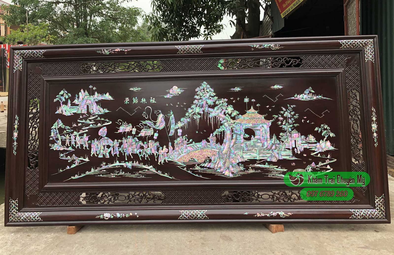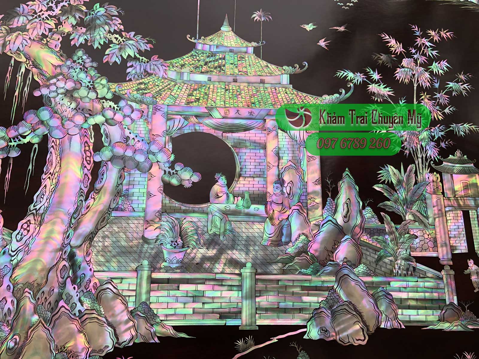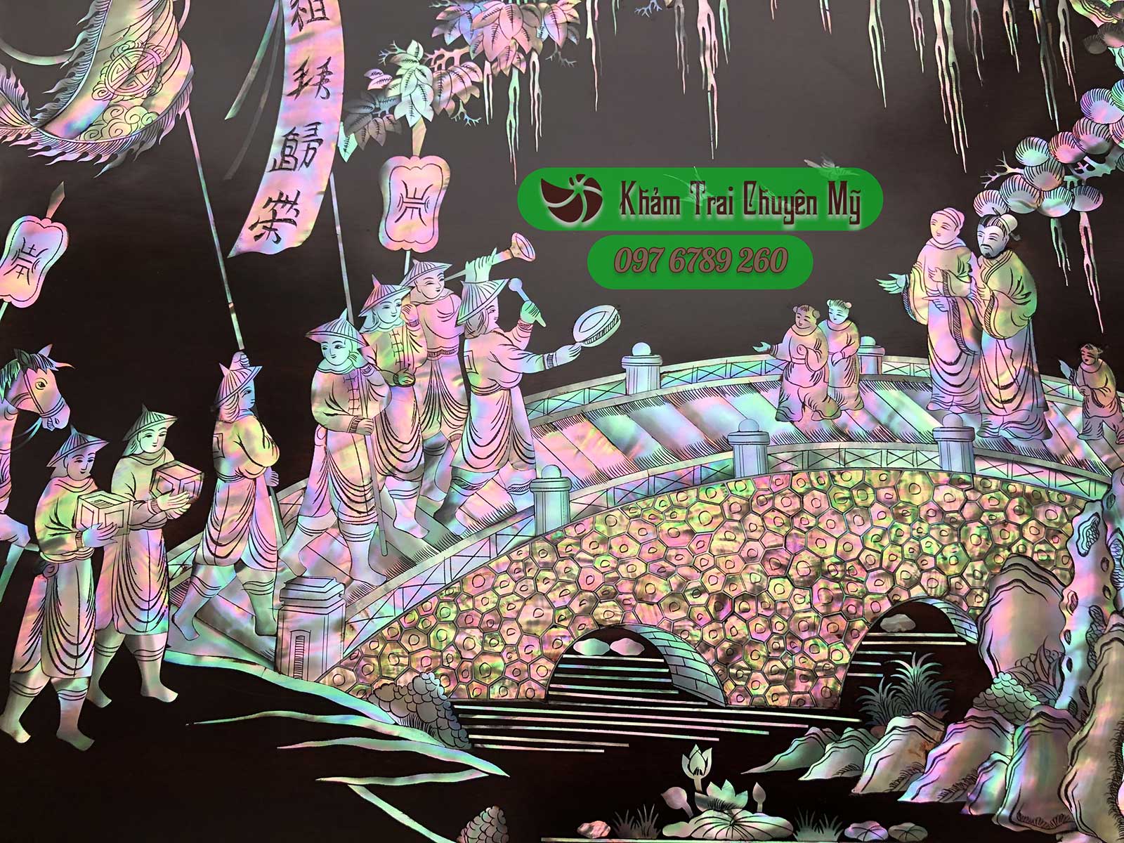 TRANH KHẢM ỐC VINH QUY BÁI TỔ Nét đẹp trường tồn qua năm tháng Tranh Vinh Quy Bái Tổ kích thước 217x107cm, khảm ốc nhập khẩu trên nền gỗ gụ.